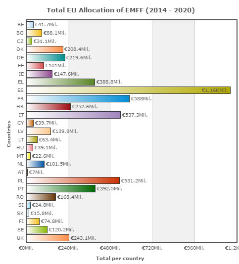 A dimensão do sector das pescas em cada país determina a sua parte do orçamento total do fundo (em Portugal, estima-se um apoio acima dos 390 milhões de euros, conforme o quadro apresentado em baixo). Cada um dos Estados dispõe de um programa operacional que define os projectos financiados, sendo que o acompanhamento da execução do programa é da responsabilidade conjunta da Comissão e das autoridades nacionais. A base legal deste fundo está no Regulamento n.°508/2014 do Parlamento Europeu e do Conselho, de 15 de Maio, que se faz acompanhar de sucessivos regulamentos de execução.